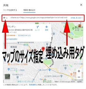そして最後は埋め込み用の地図のサイズ指定と、HTMLタグをコピペしてサイトに貼るだけ。